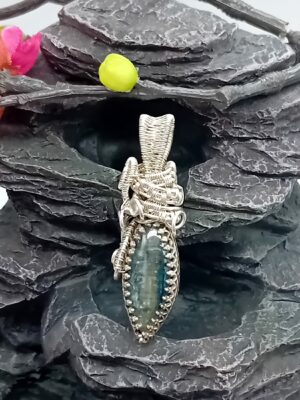 Fein, edel und voller Klarheit: Dieser Disthen-Anhänger (auch bekannt als Kyanit) fasziniert durch sein bläulich-durchscheinendes Farbspiel. Das zierliche Schmuckstück wirkt elegant. Besonders durch die interessante und gewebte Silberfassung auf dem leicht rautenförmigen Stein. Ideal für alle, die natürliche Schönheit und schlichte Eleganz schätzen.