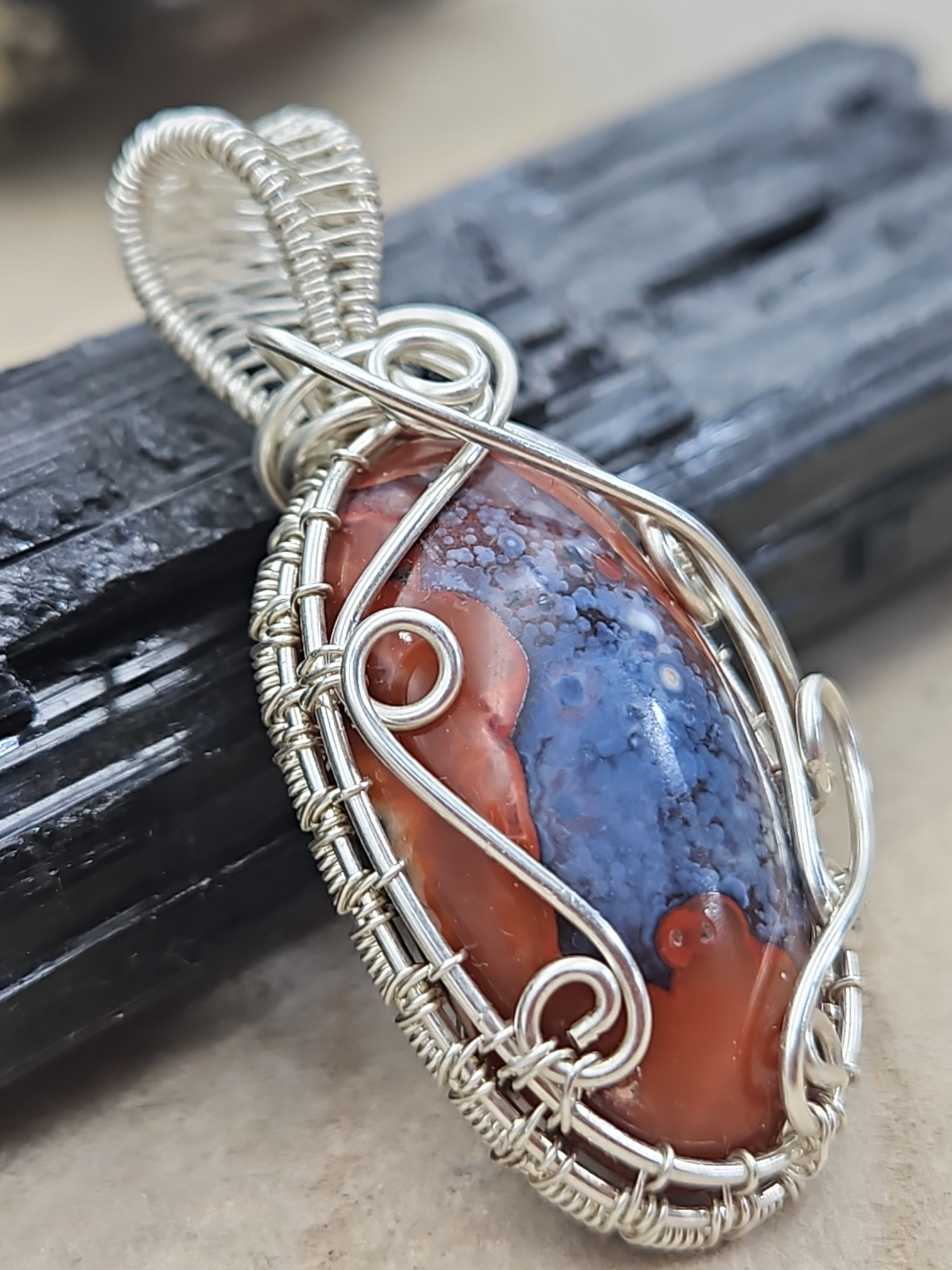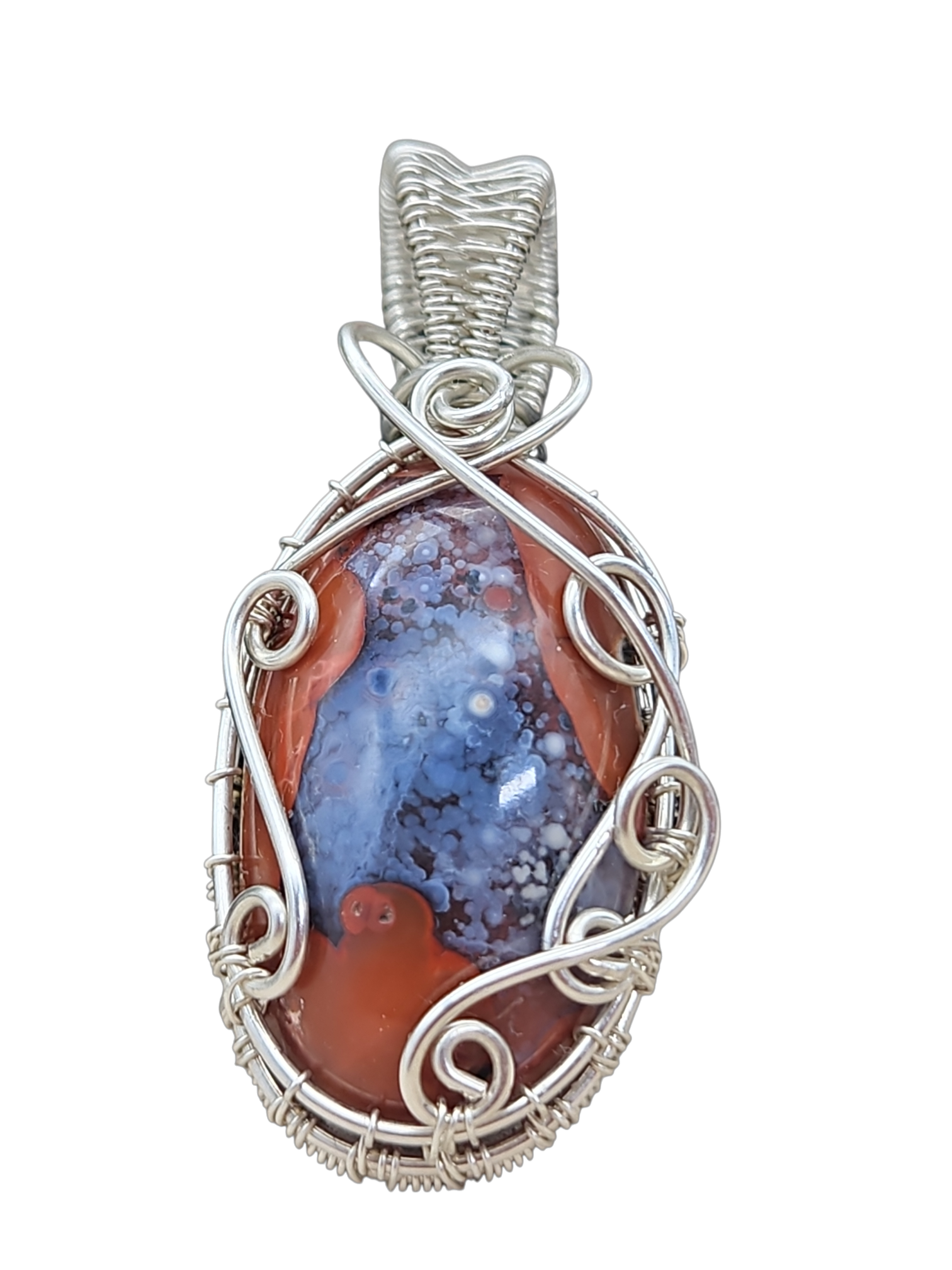 Anhänger mit einem ausgefallen gemusterten Achat, den ich in Sterlingsilber gefasst habe. Das Muster wirkt, als ob Blasen aufsteigen. Gute-Laune-Stein mit verspielter Fassung.