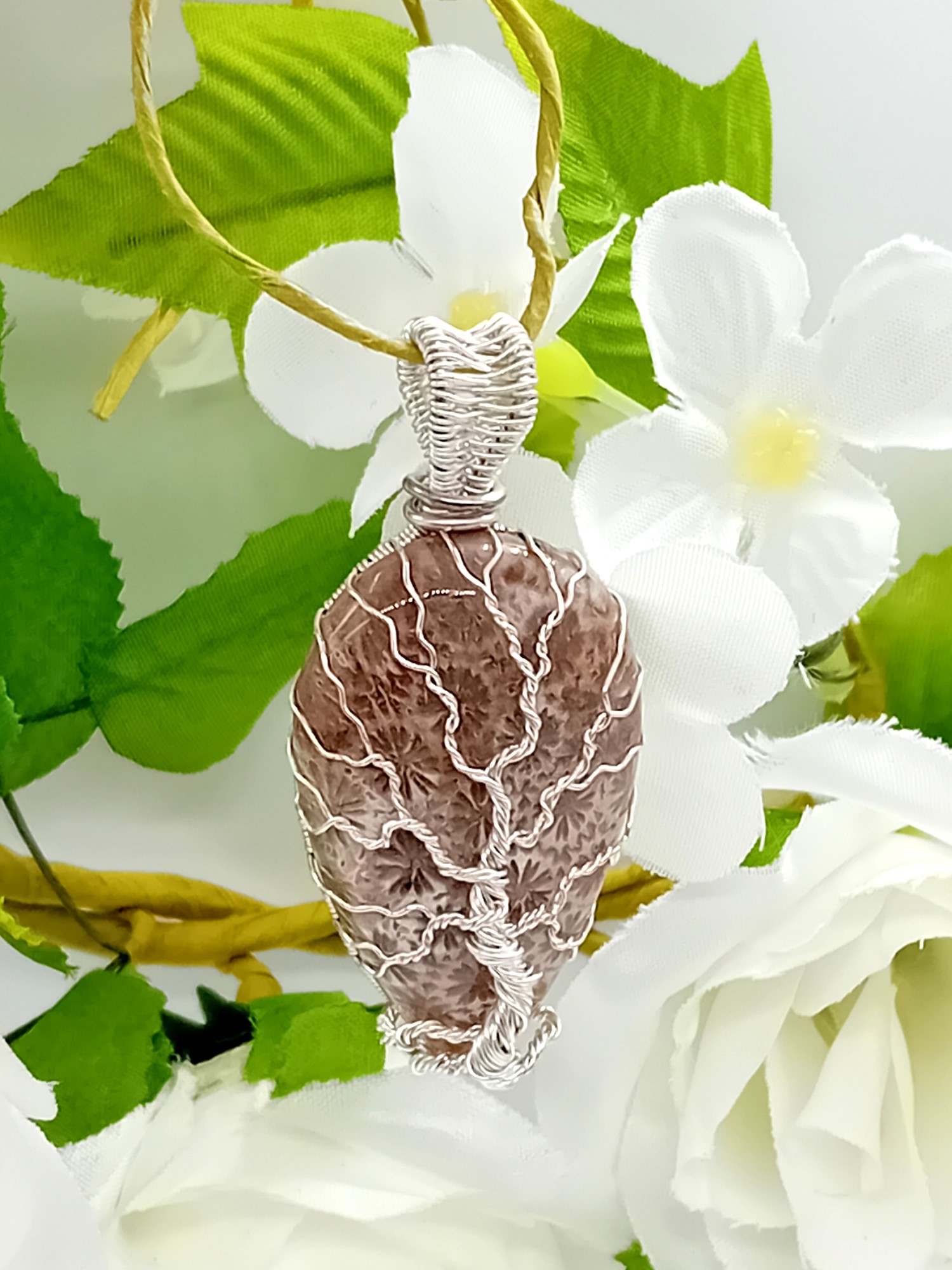 Anhänger fossile Koralle 925 Silber mit Lebensbaum