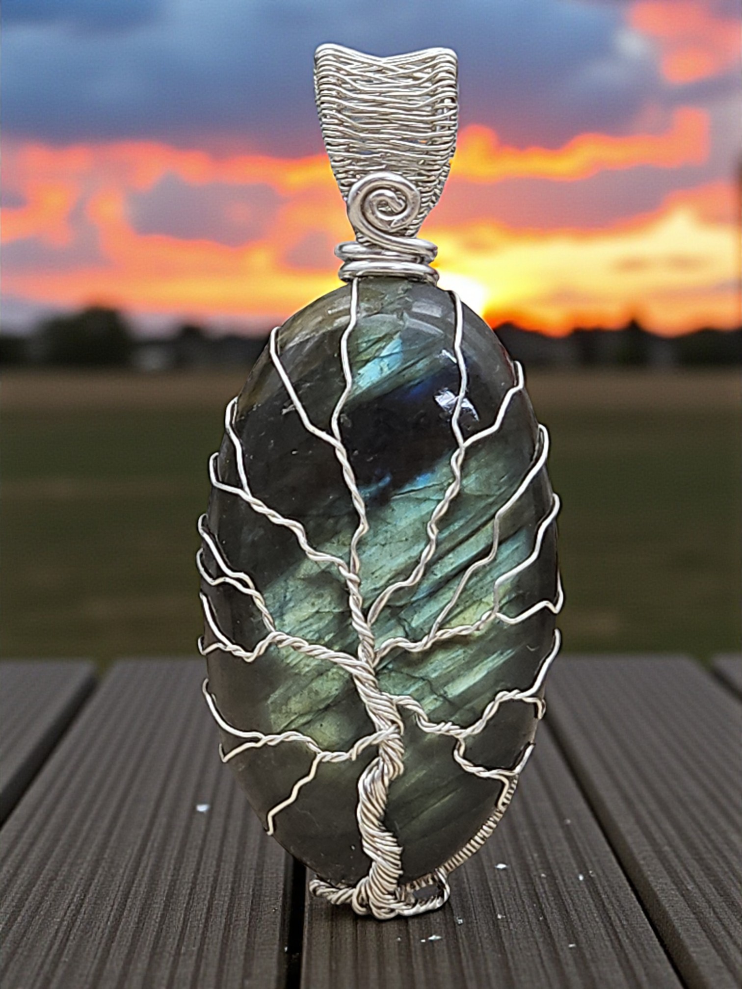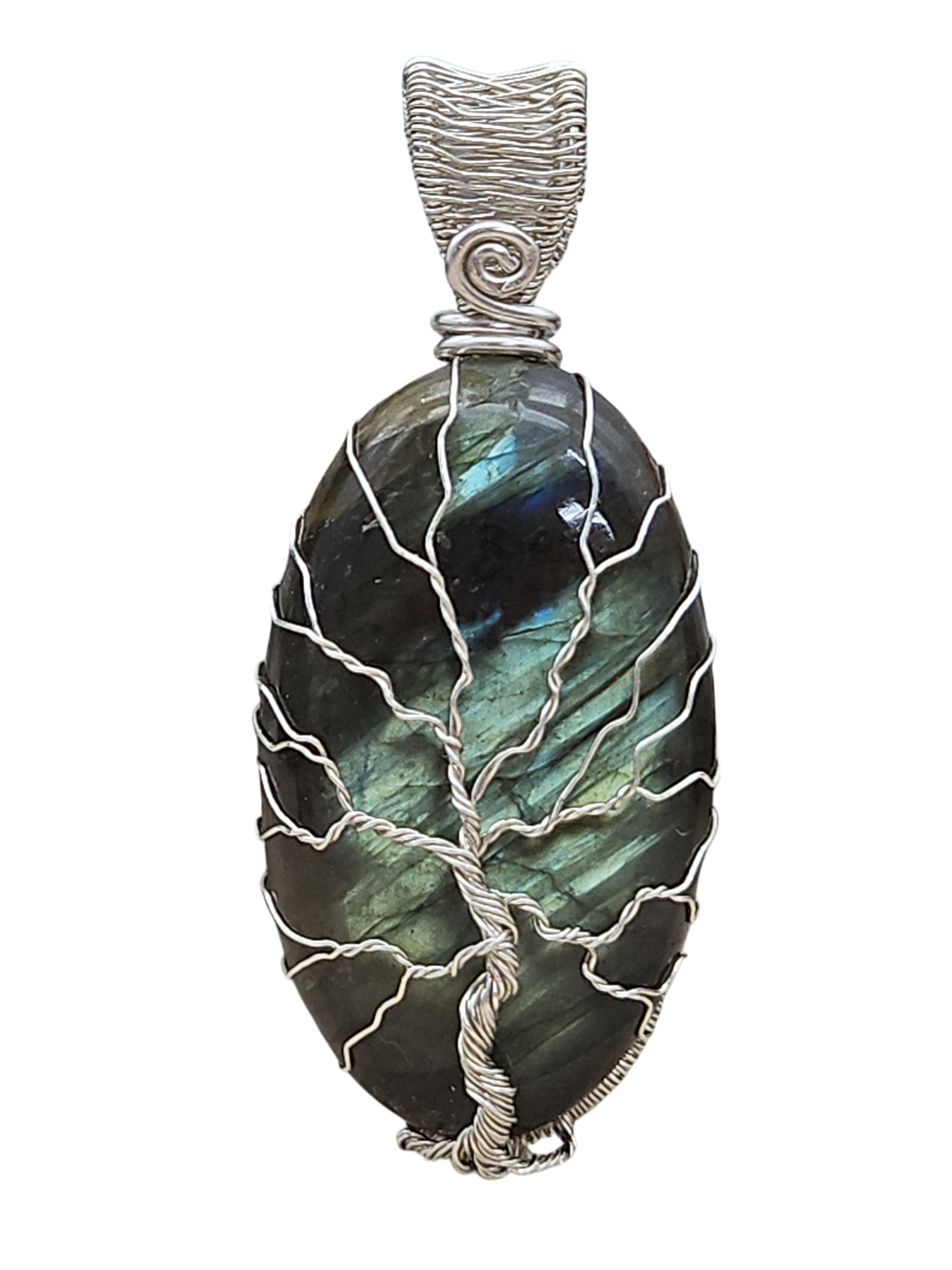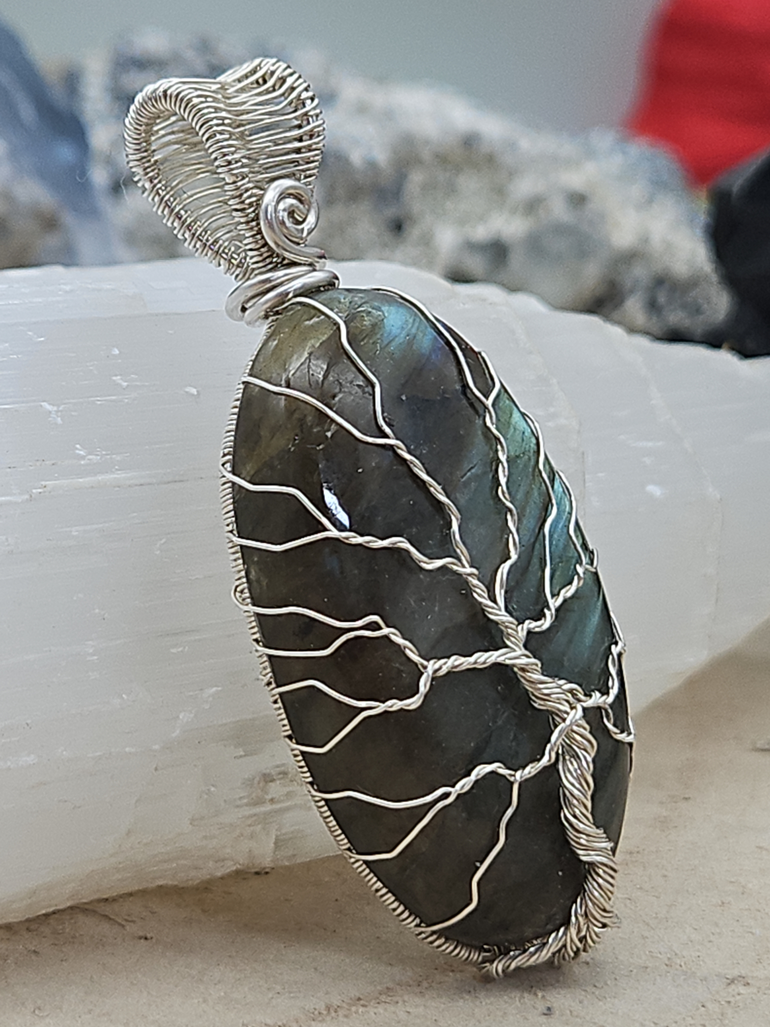Leuchtender Labradorit mit aufgearbeitetem Baum aus Sterlingsilber. Dies ist der Anhänger, den ich vor einigen Wochen im Facebook-Live angefertigt habe. Labradorit mit der klassischen Streifenstruktur in blassem Gelb (teilweise grünlich) mit Blau. Bei jeder Bewegung leuchtet der Stein an unterschiedlichen Stellen.