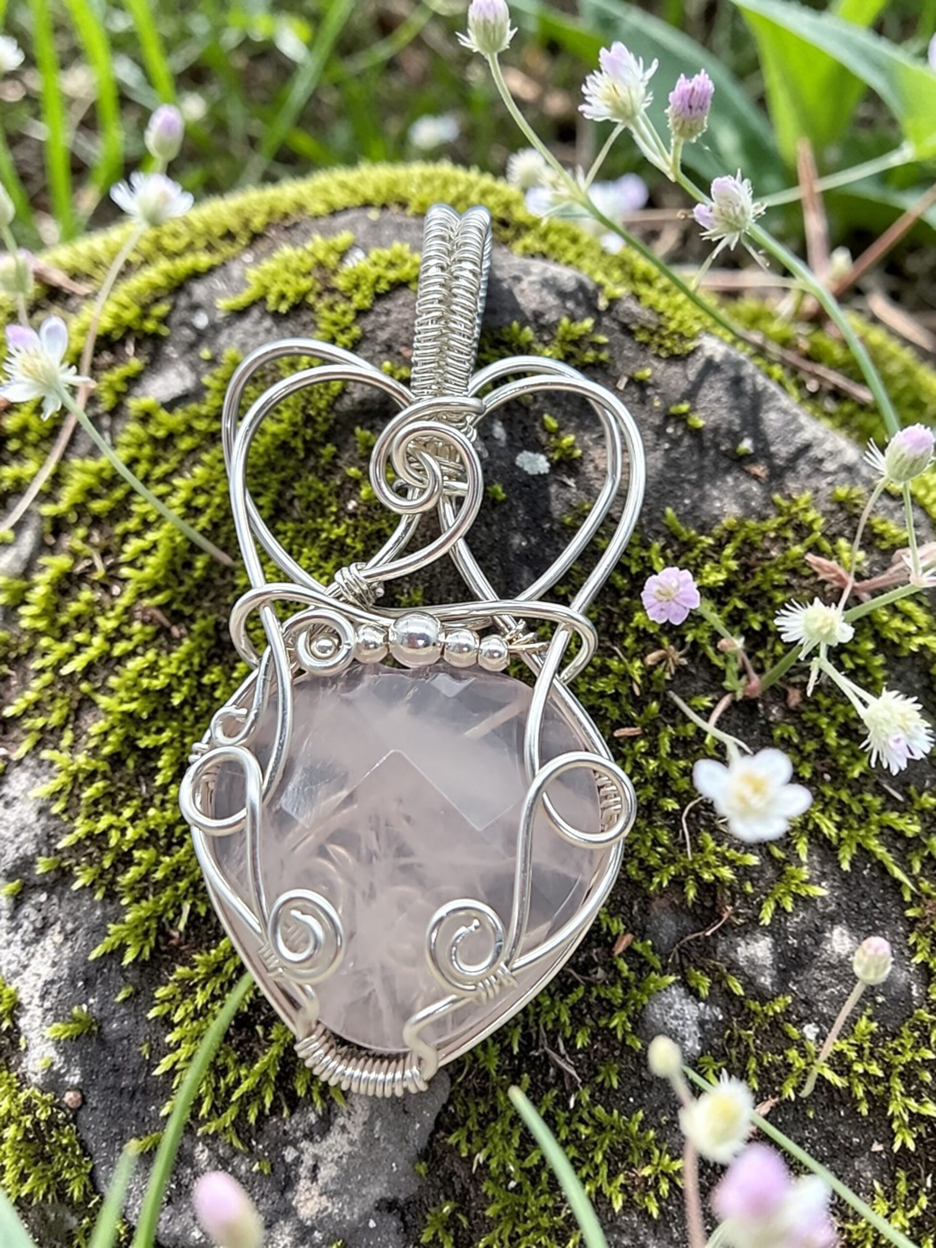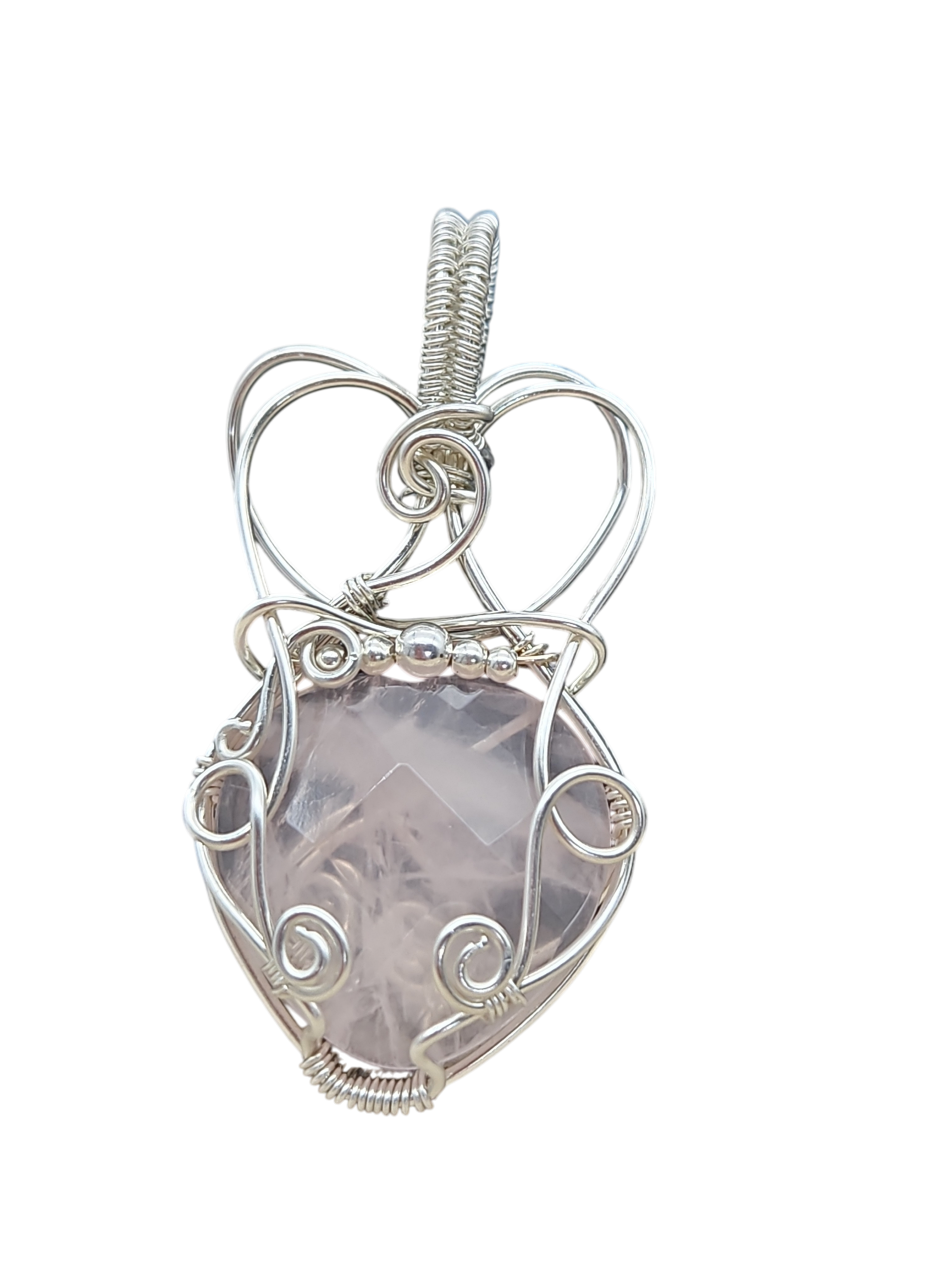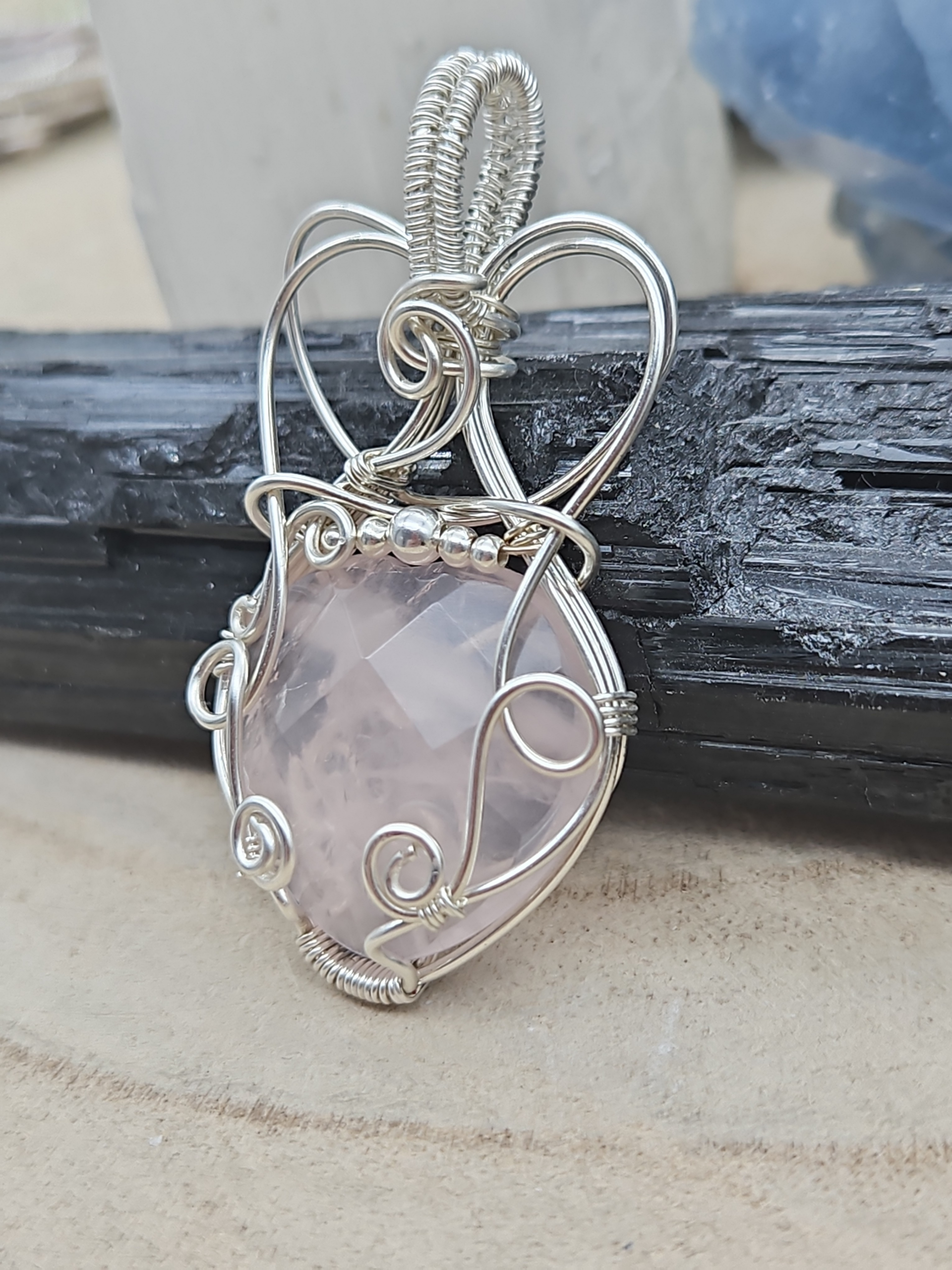 Verspielt und romantisch ist dieser Anhänger mit einem facettierten Rosenquarz-Herz in ausgefallener Sterlingsilberfassung. Leicht durchscheinend ist der Stein, so blitzt die Rückseite der Fassung, auf der ich die Schnörkel fortgesetzt habe, je nach Lichteinfall durch.