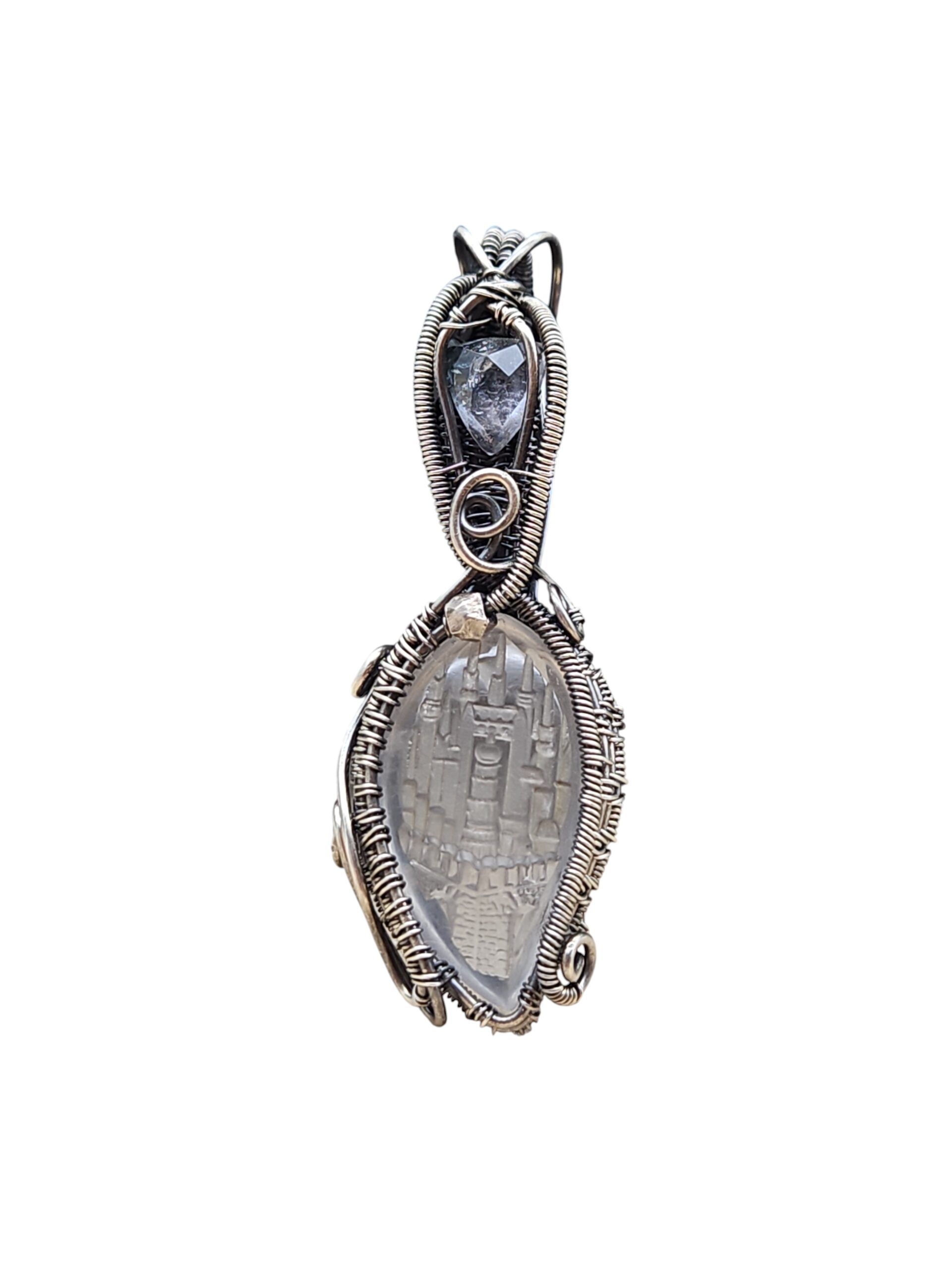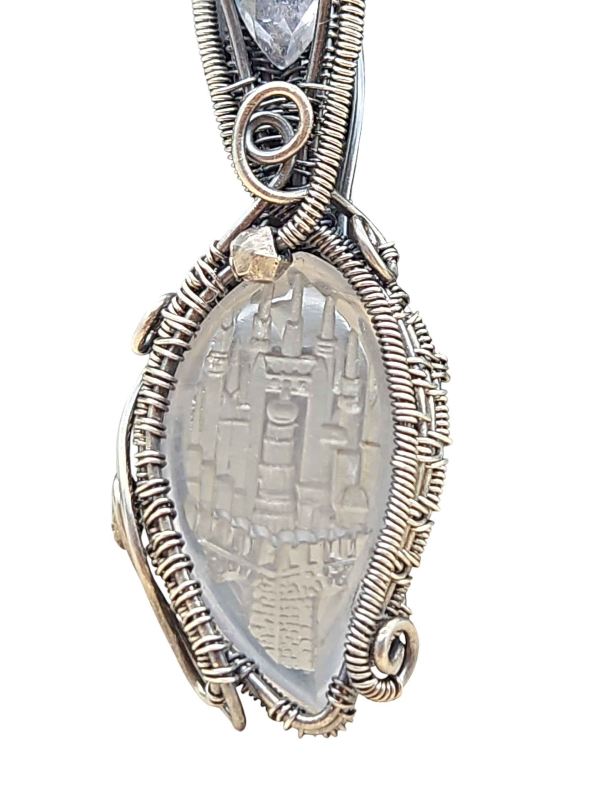 Anhänger aus Sterlingsilber mit in Rosenquarz gravierter Burg und weiß-blauem Turmalin, 5,4 x 1,9 cm