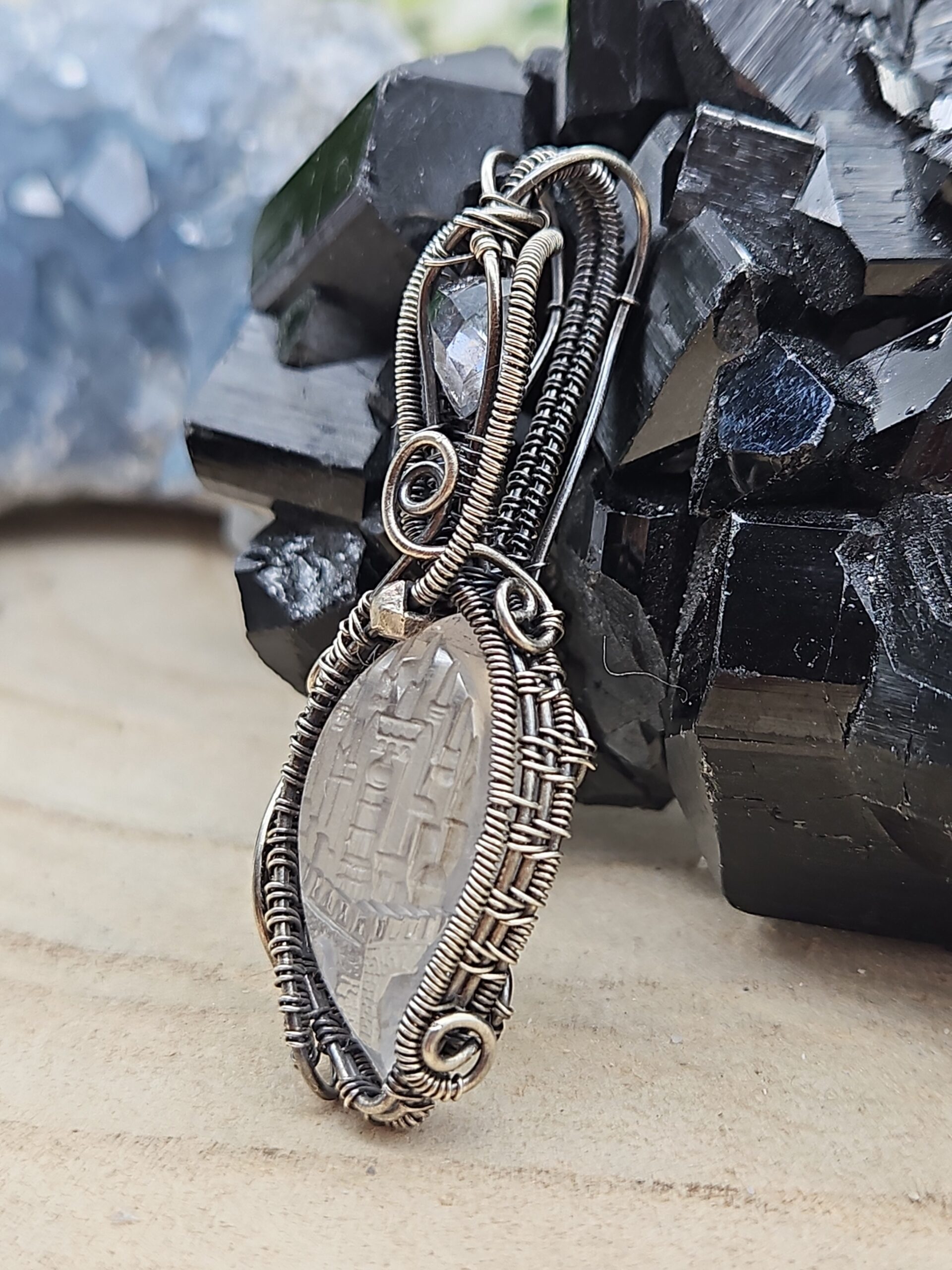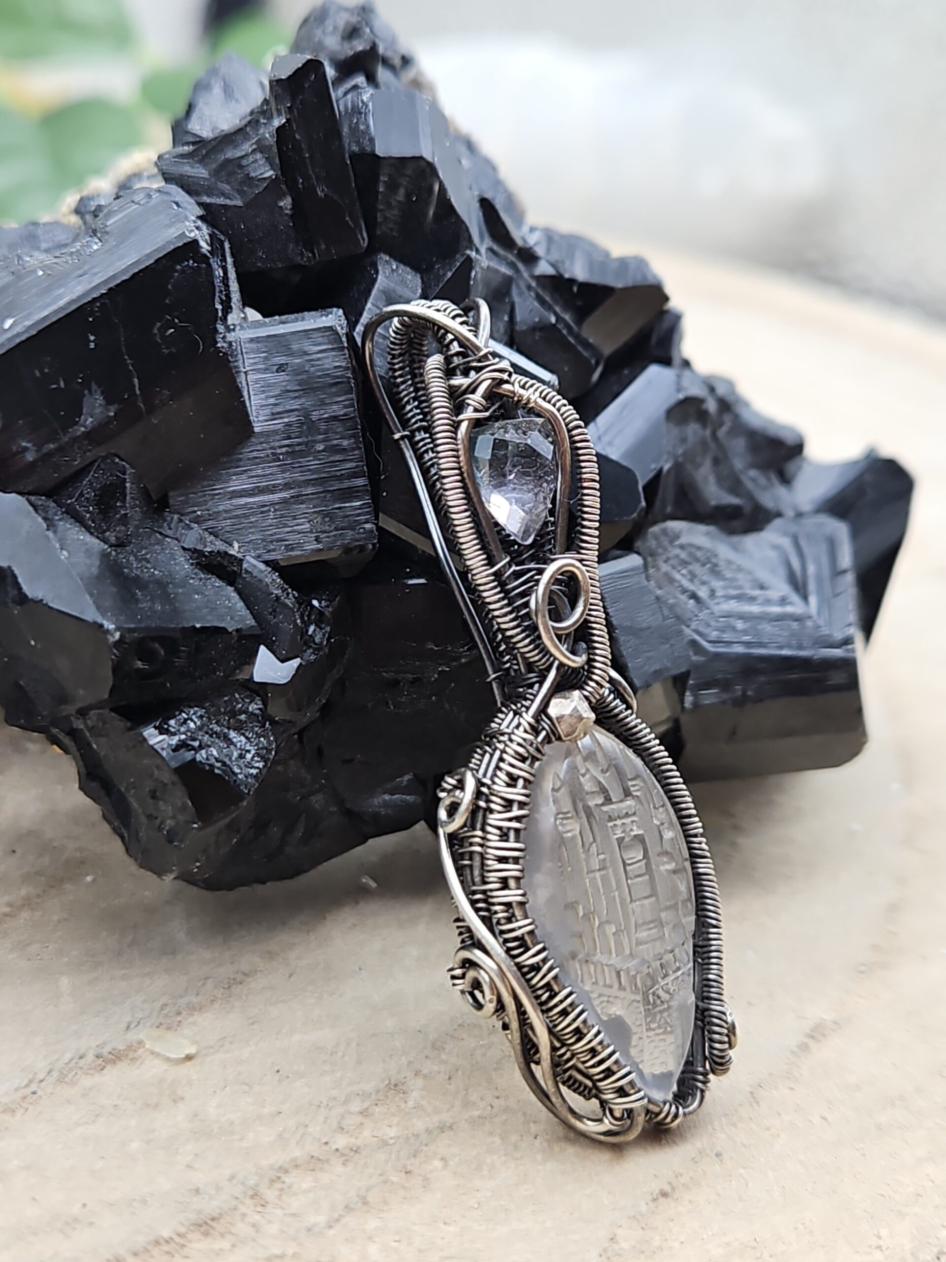 Ausgefallenes Unikat für die Fans von Fantasy, Mittelalter und größeren, auffälligen Stücken. Heller Rosenquarz (fast klar) mit auf der Oberfläche geschnitzter Burg. Grobes Gemäuer, viele Türme, ein Klassiker aus dem Mittelalter. Kombiniert habe ich den asymetrisch geschliffenen Stein mit einem klaren Turmalin mit blauer Ecke im Rosecut-Schliff. Die Fassung ist komplex und mehrschichtig, dazu habe ich das Sterlingsilber patiniert. Die Gravur wie auch die gewebten Drahtmuster kommen so besser zur Geltung.