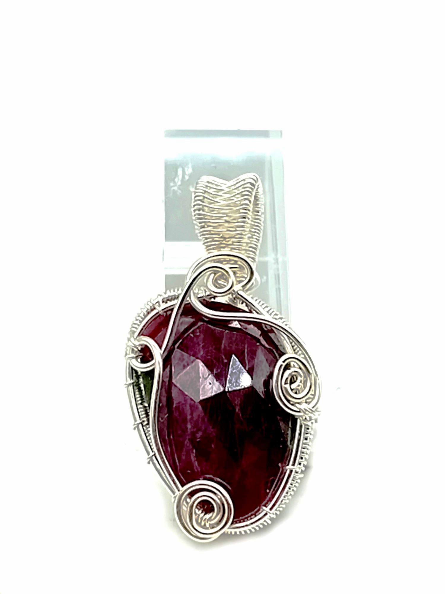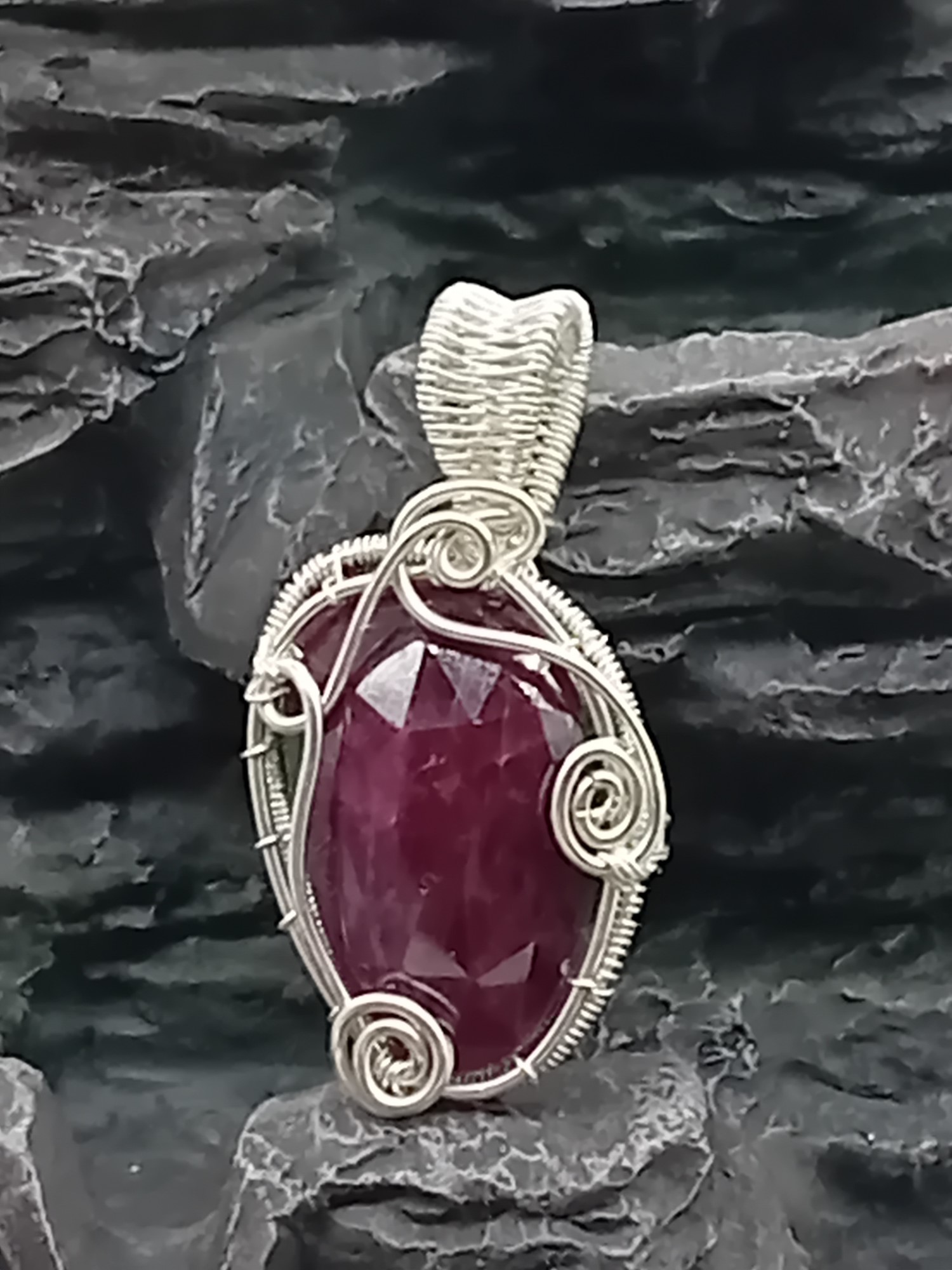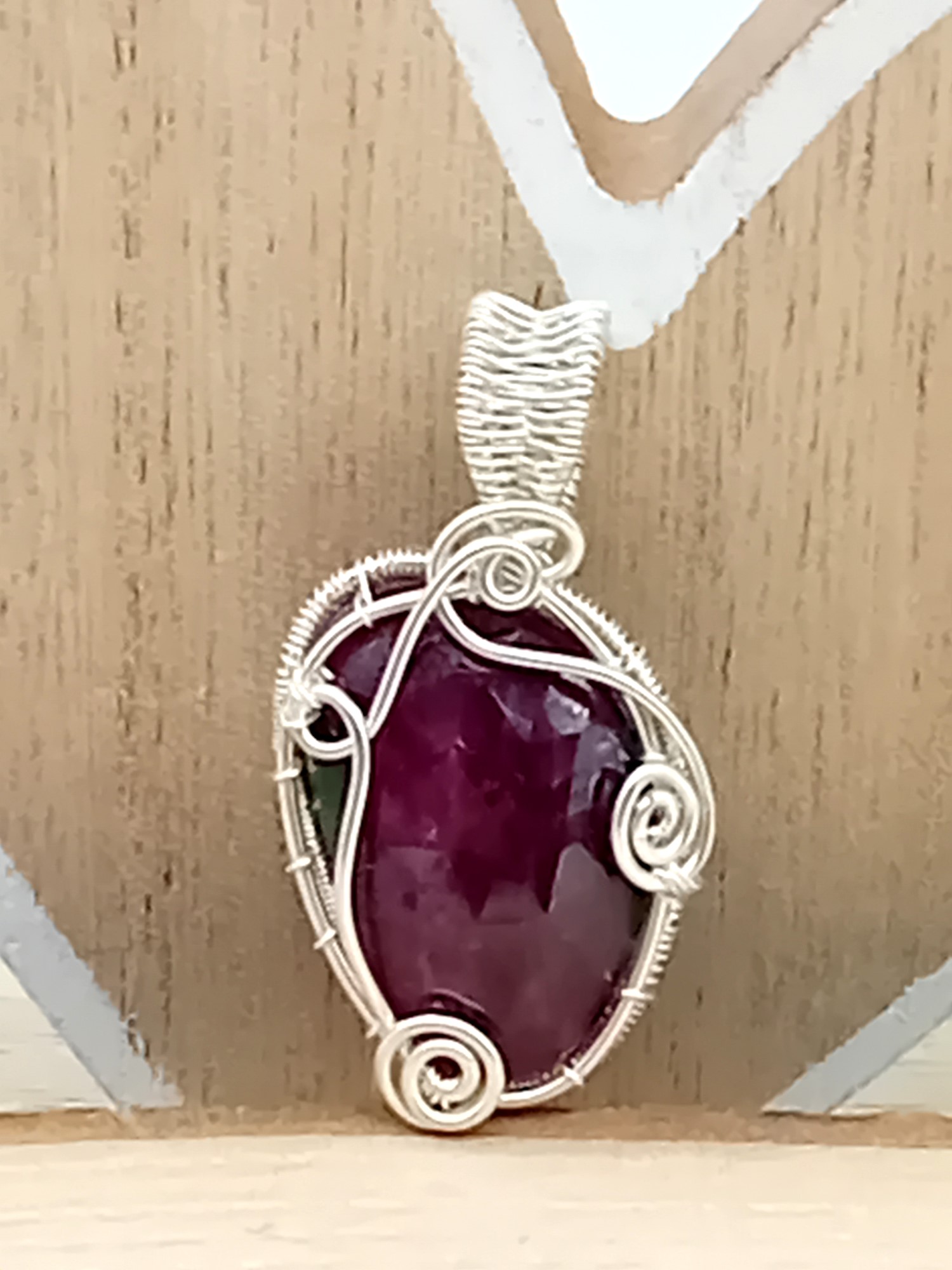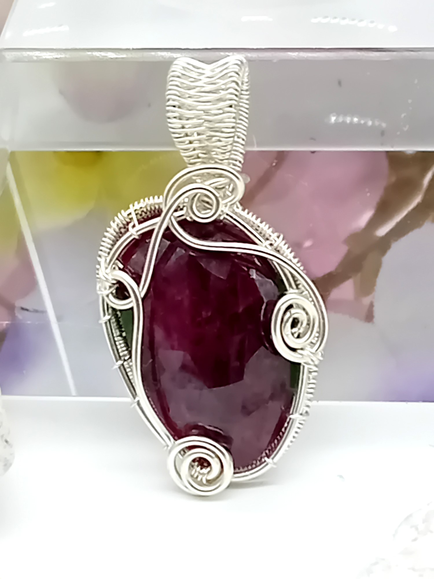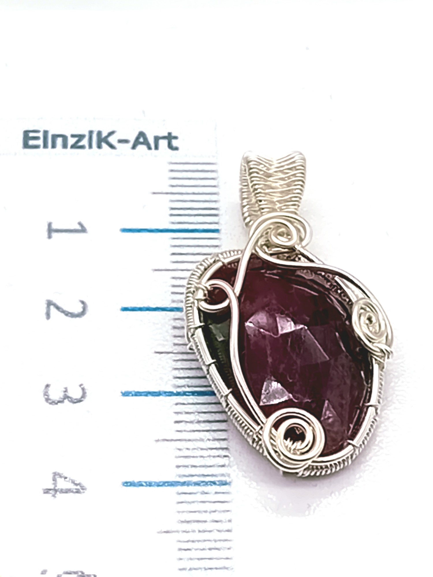 Dieser elegante Anhänger vereint die intensive Farbwirkung des Rubin-Zoisits mit der feinen Kunst des Silberdraht-Designs.