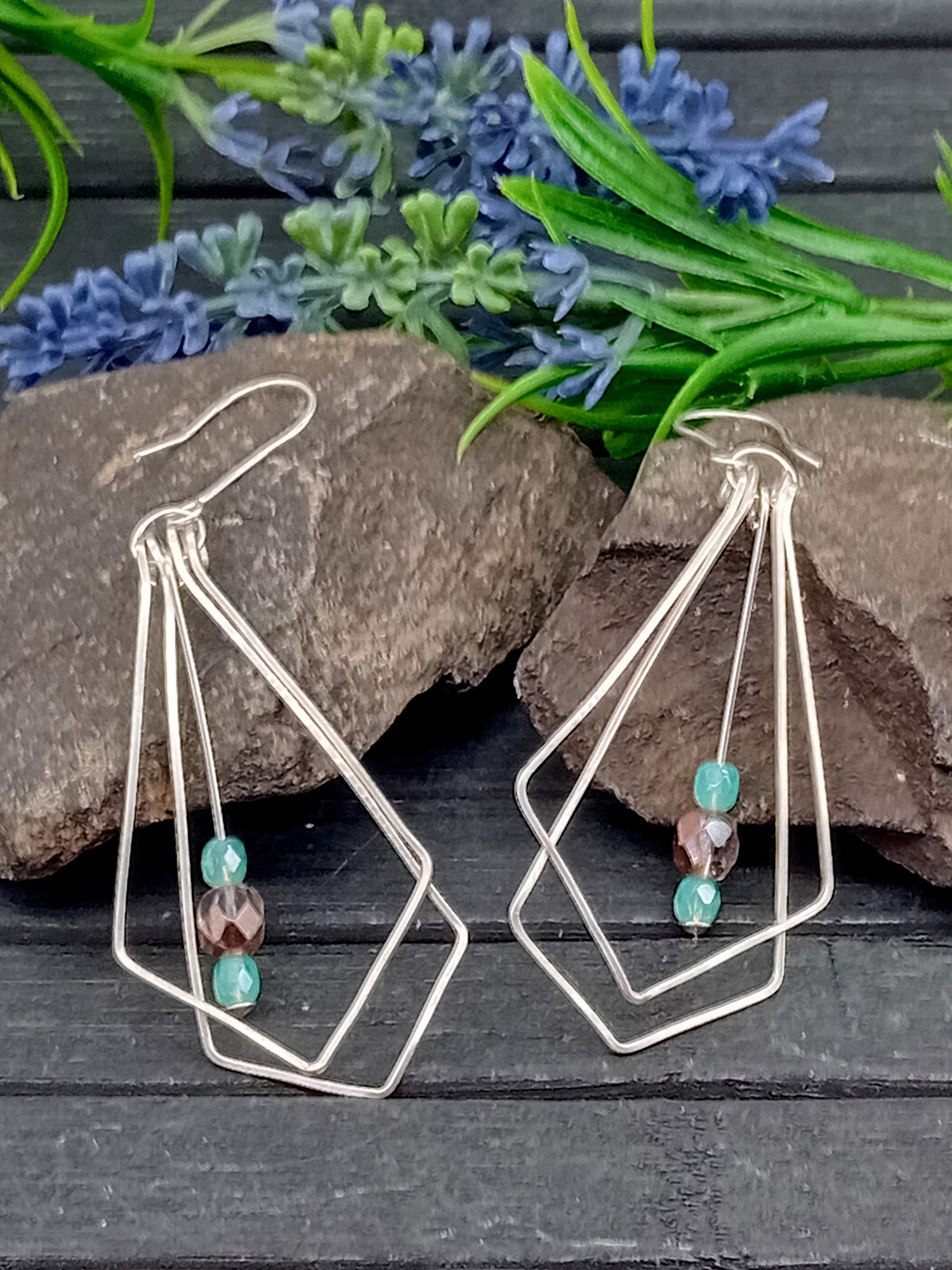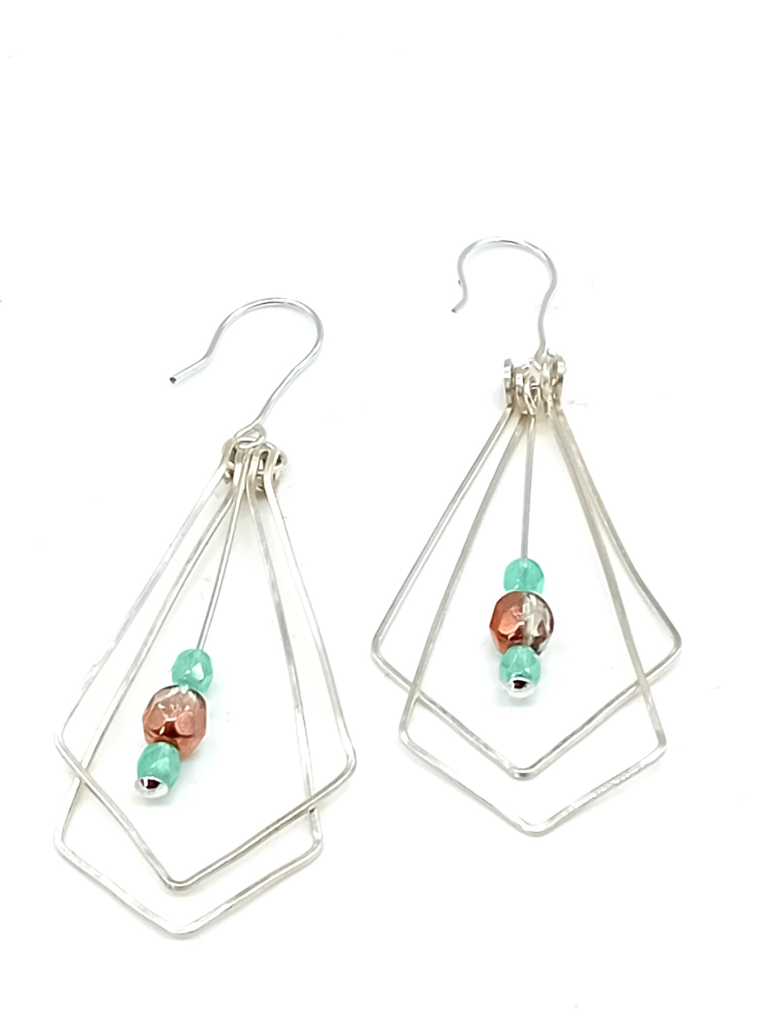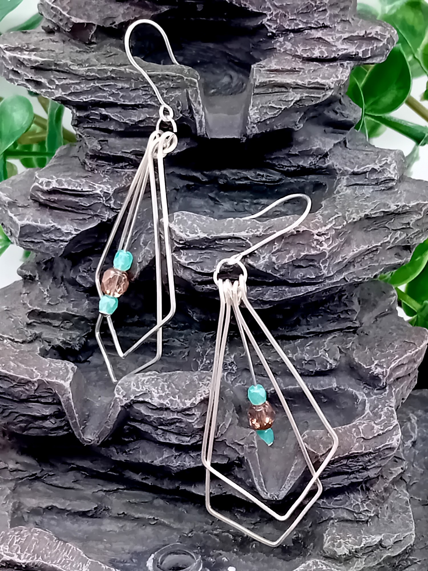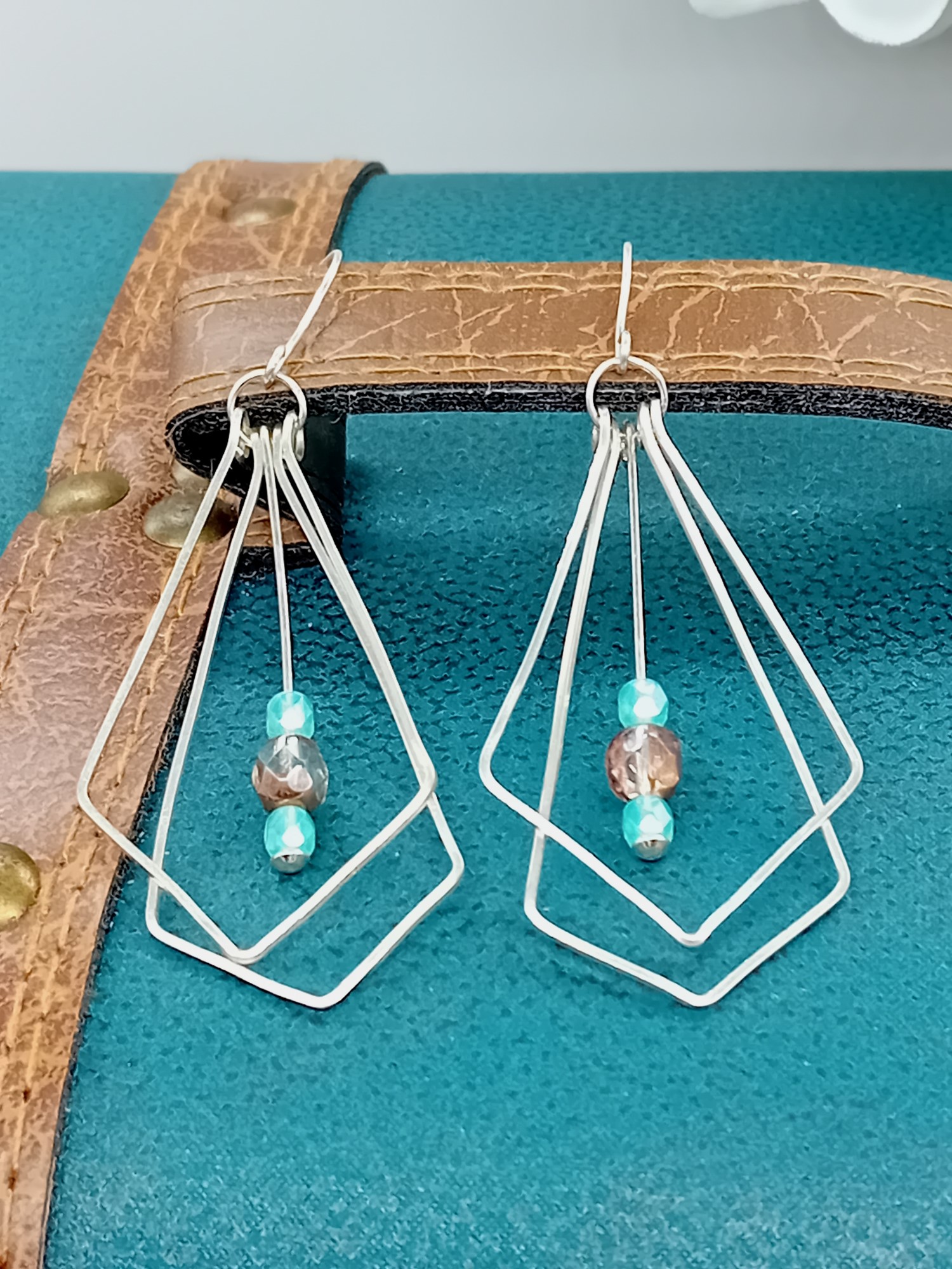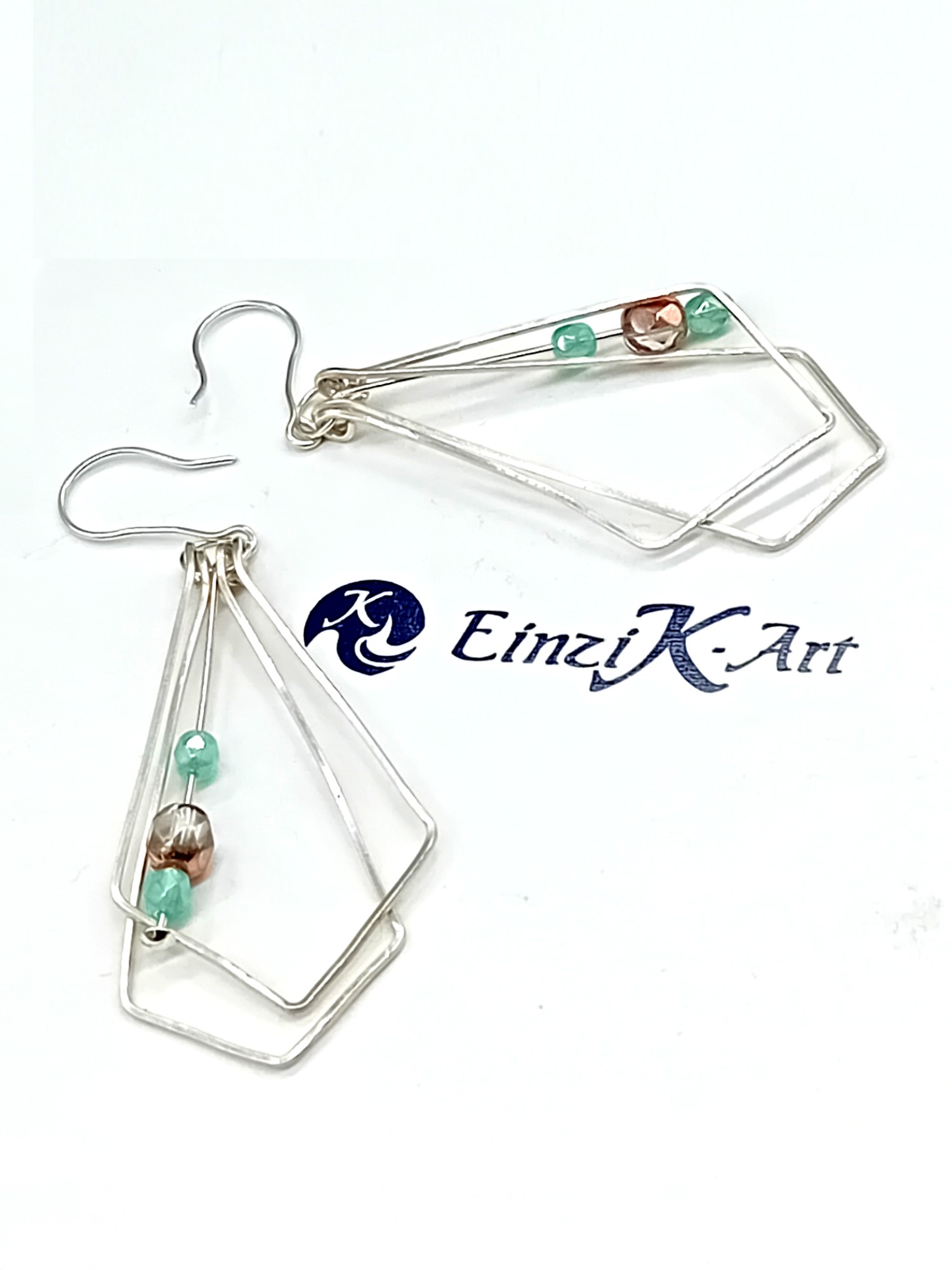 Diese modernen Ohrhänger aus 925er Silber bestechen durch ihre klare Rautenform und eine filigrane, handgearbeitete Drahtgestaltung. Zarte Glasperlen in Türkis- und Bernsteintönen setzen einen feinen Farbakzent und sorgen für eine leichte, schwebende Wirkung.
