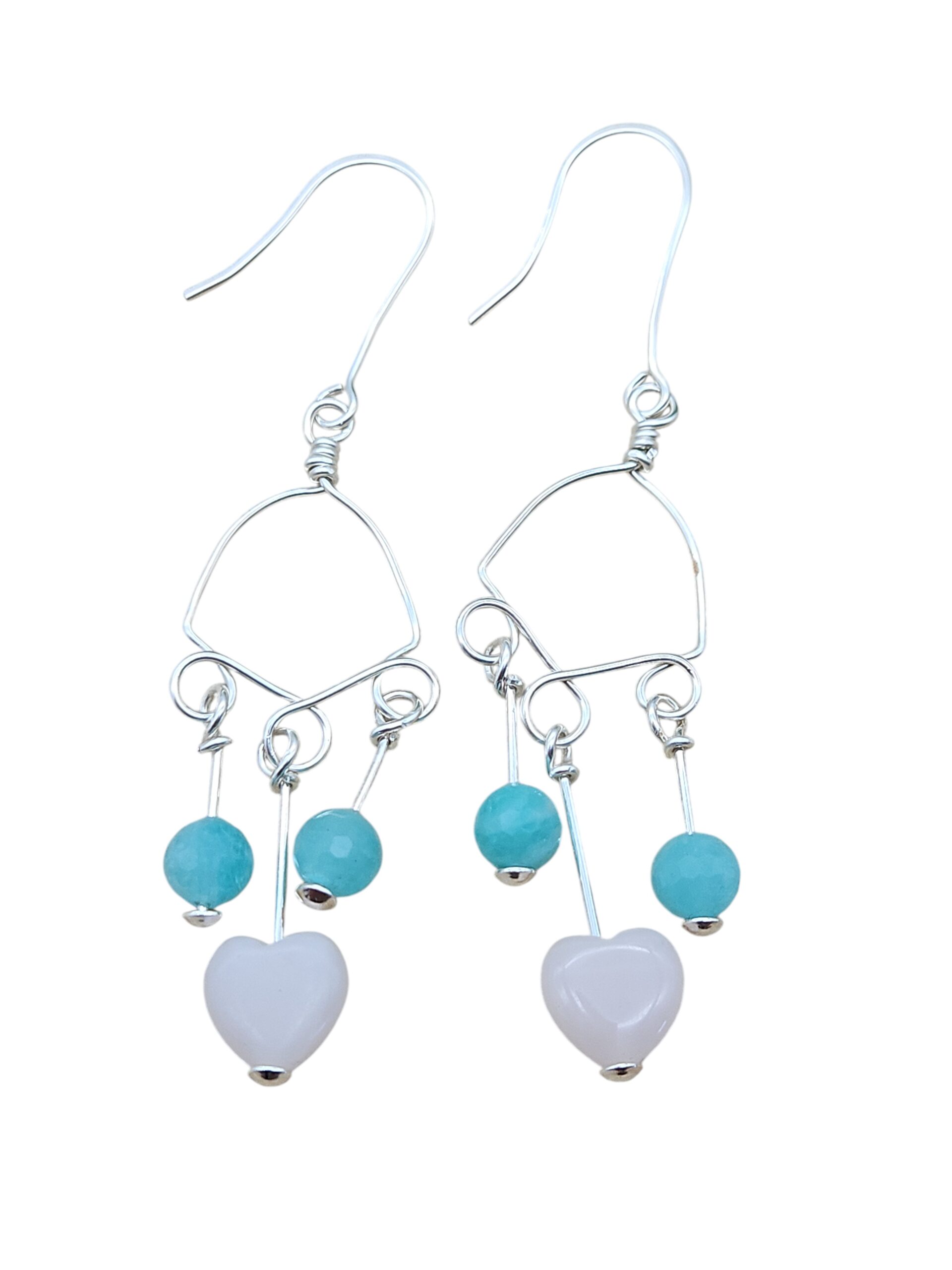 Wenns leicht und verspielt sein soll, dann sind diese offenen Draht-Ohrringe mit jeweils einem Rosenquarz Herz und 2 facettierten Amazonit Perlen perfekt. Die Form aus Sterlingsilberdraht ist offen, die Edelsteinperlen sind so angebracht, dass sie frei hängen. Die Ohrhänger sind komplett aus Sterlingsilber angefertigt.