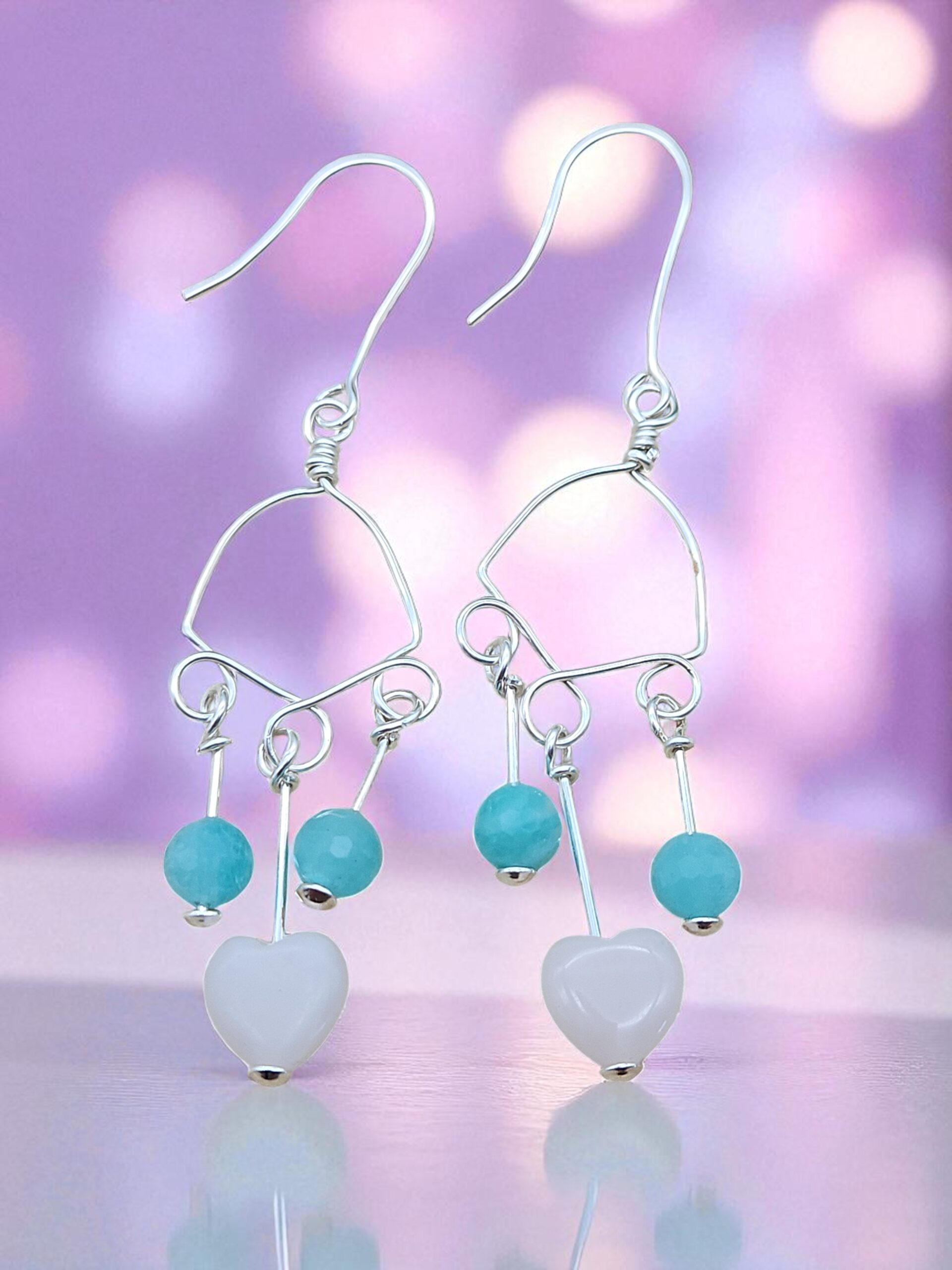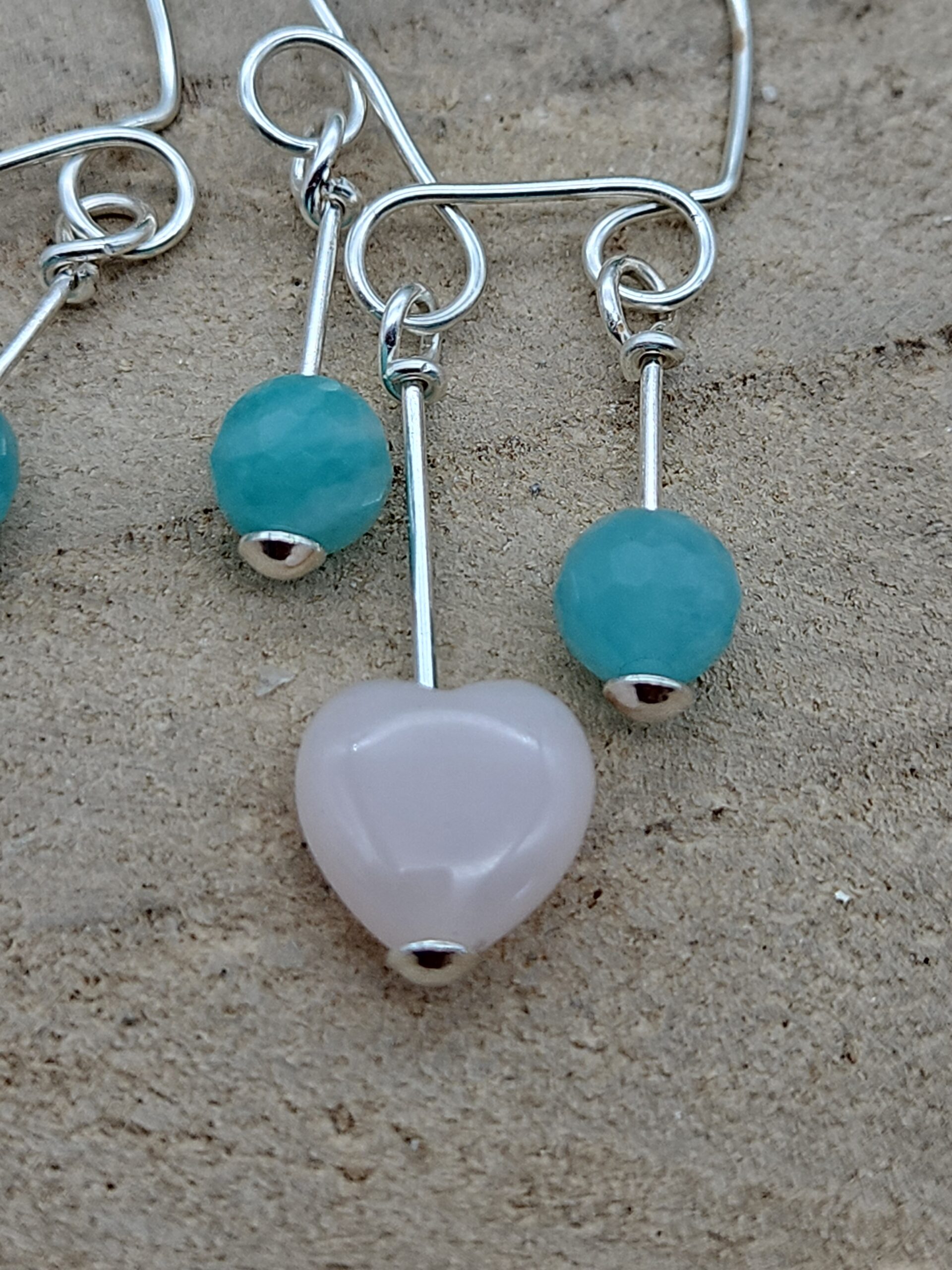 verspielte Ohrhänger aus Sterlingsilber mit je einem Rosenquarz Herz und 2 facettierten Amazonit-Perlen 7,6 cm lang