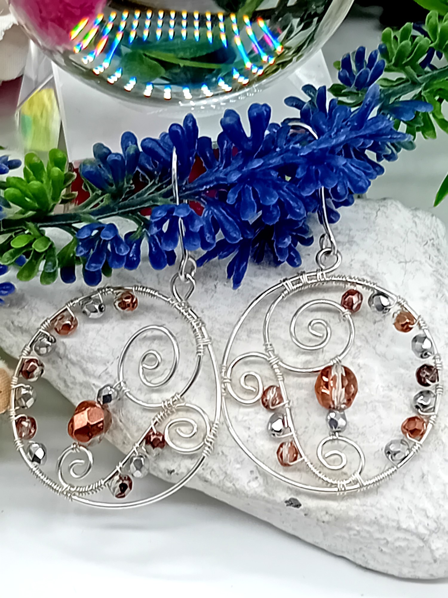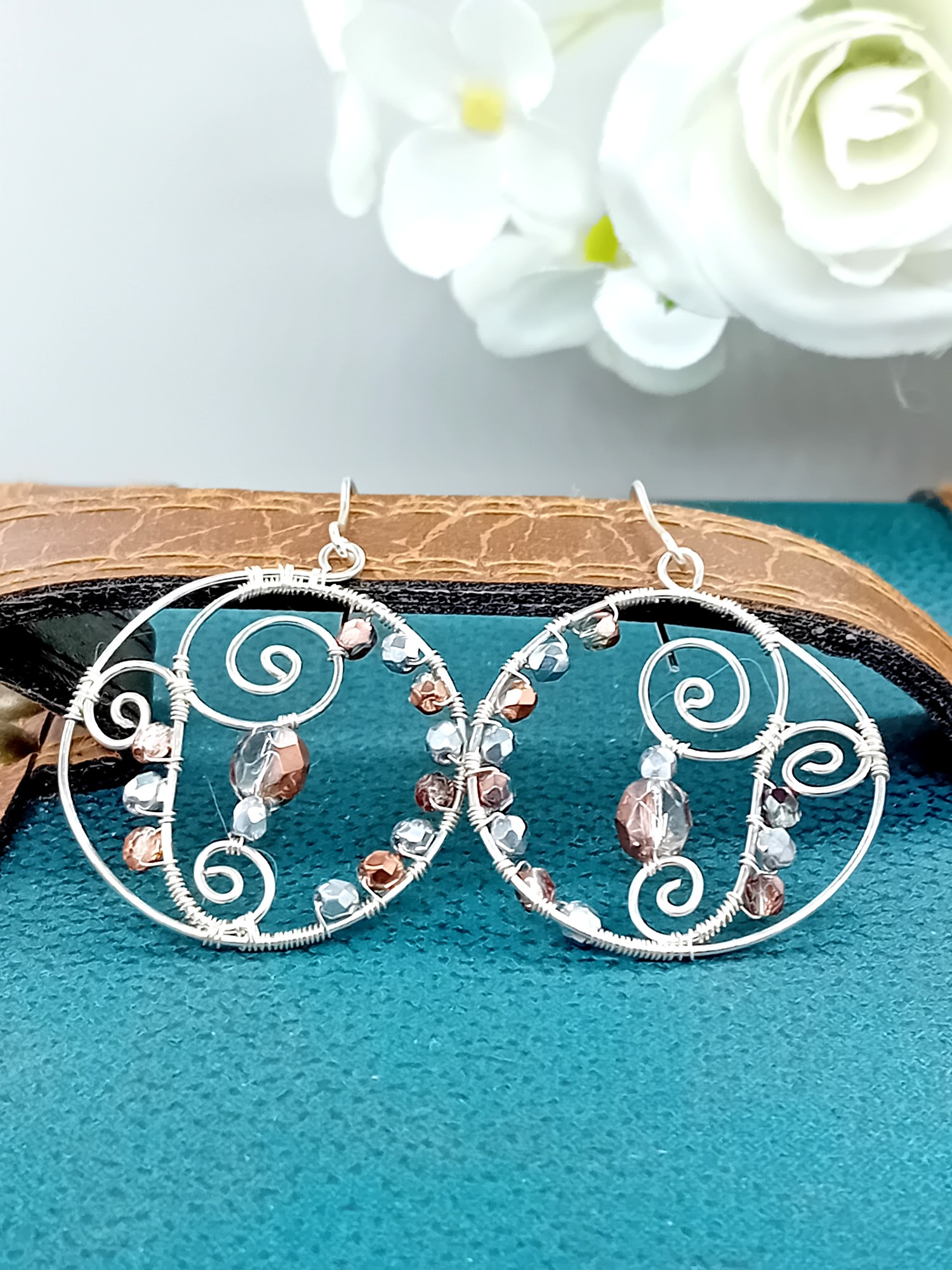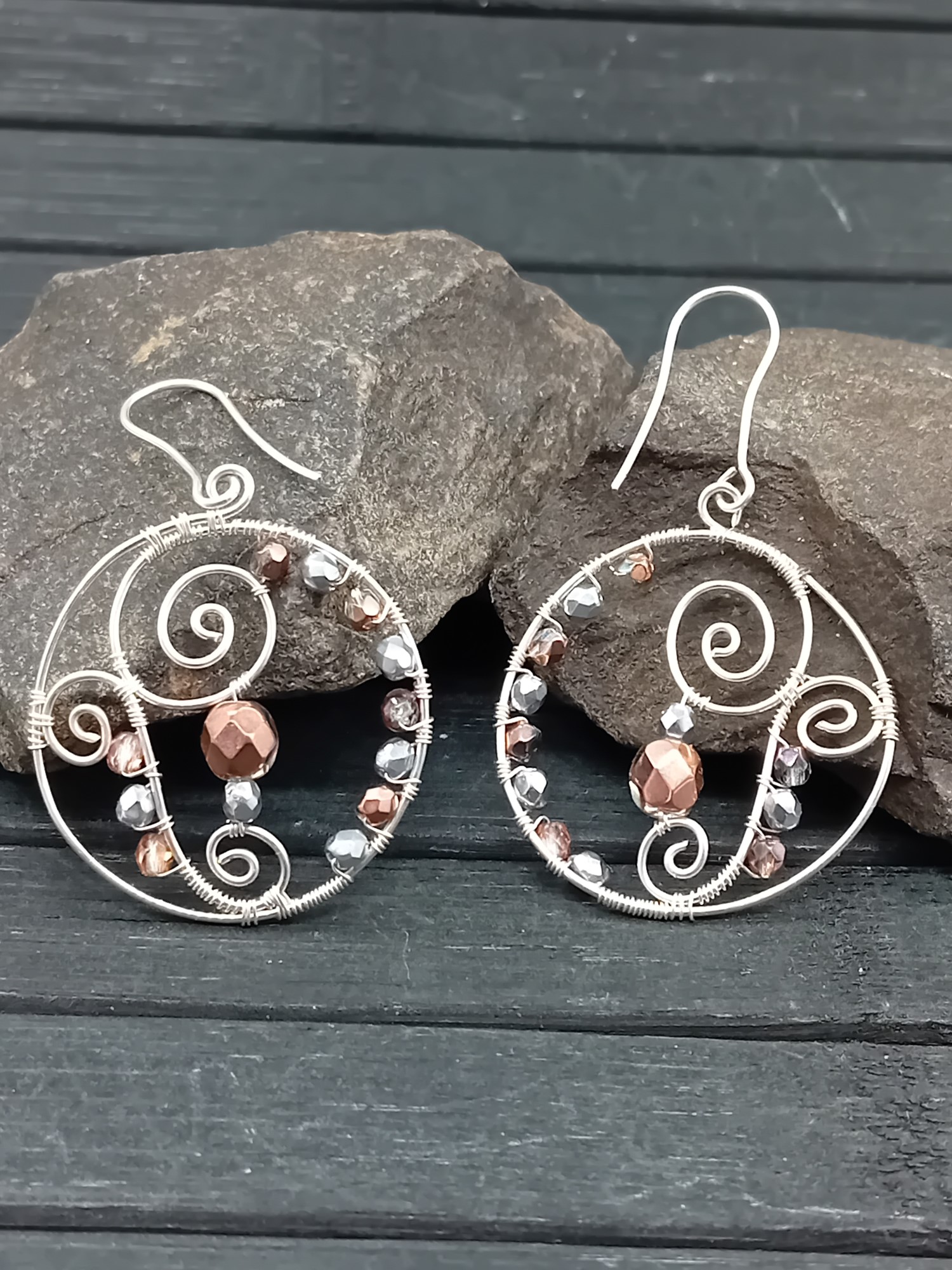 Diese handgearbeiteten Ohrhänger aus 925er Silber überzeugen durch ihre runde Form und eine kunstvolle Drahtwicklung. Die bernsteinfarbenen Glasperlen setzen warme, lebendige Akzente und verleihen den Ohrringen eine harmonische, zeitlose Ausstrahlung.