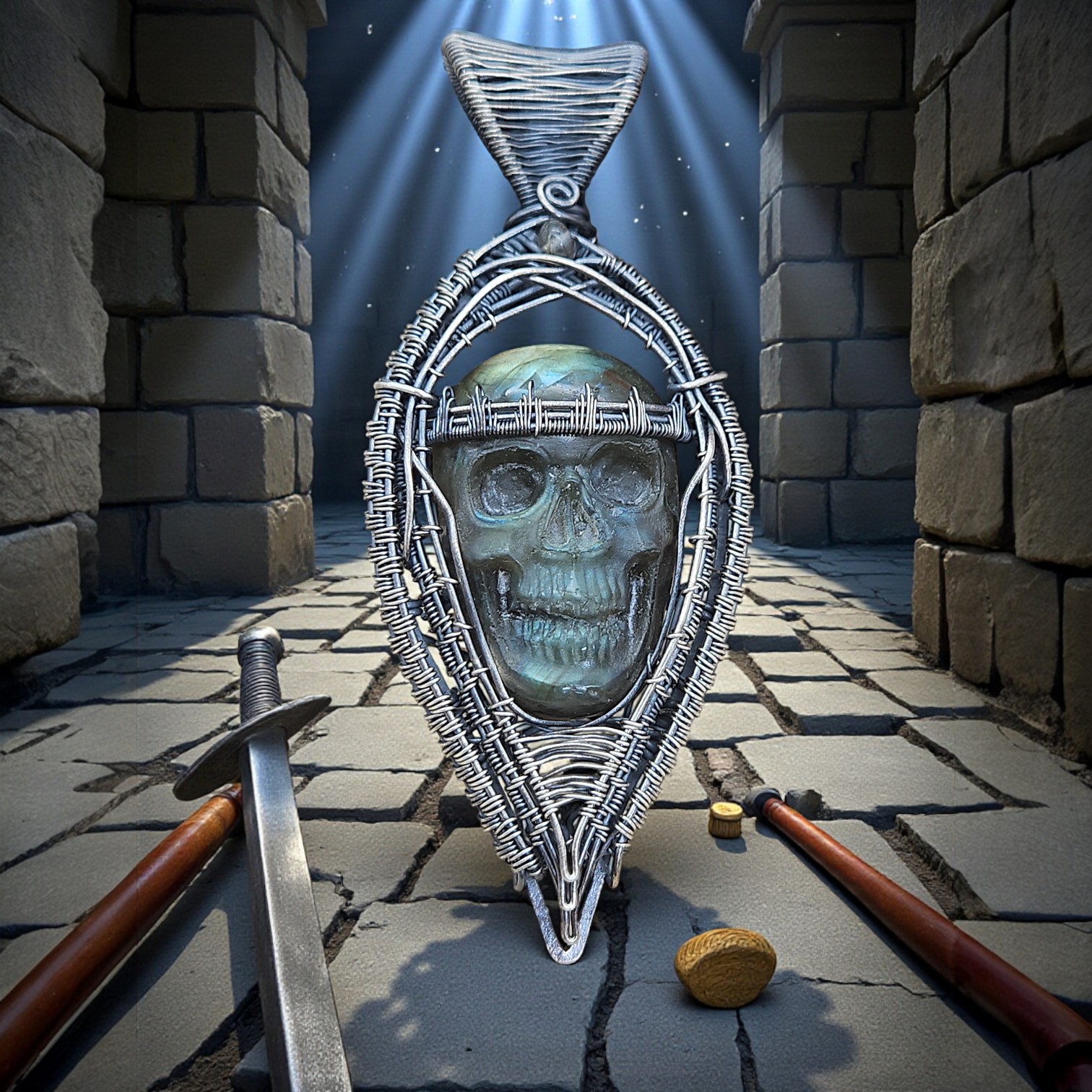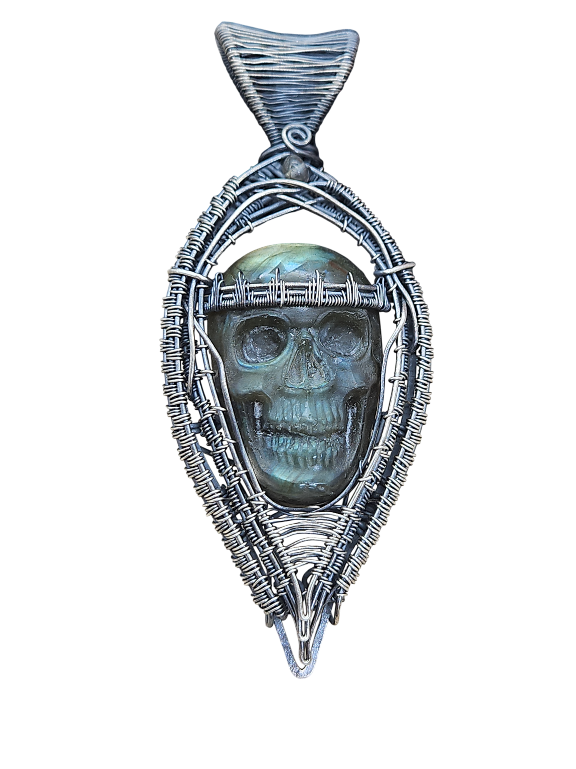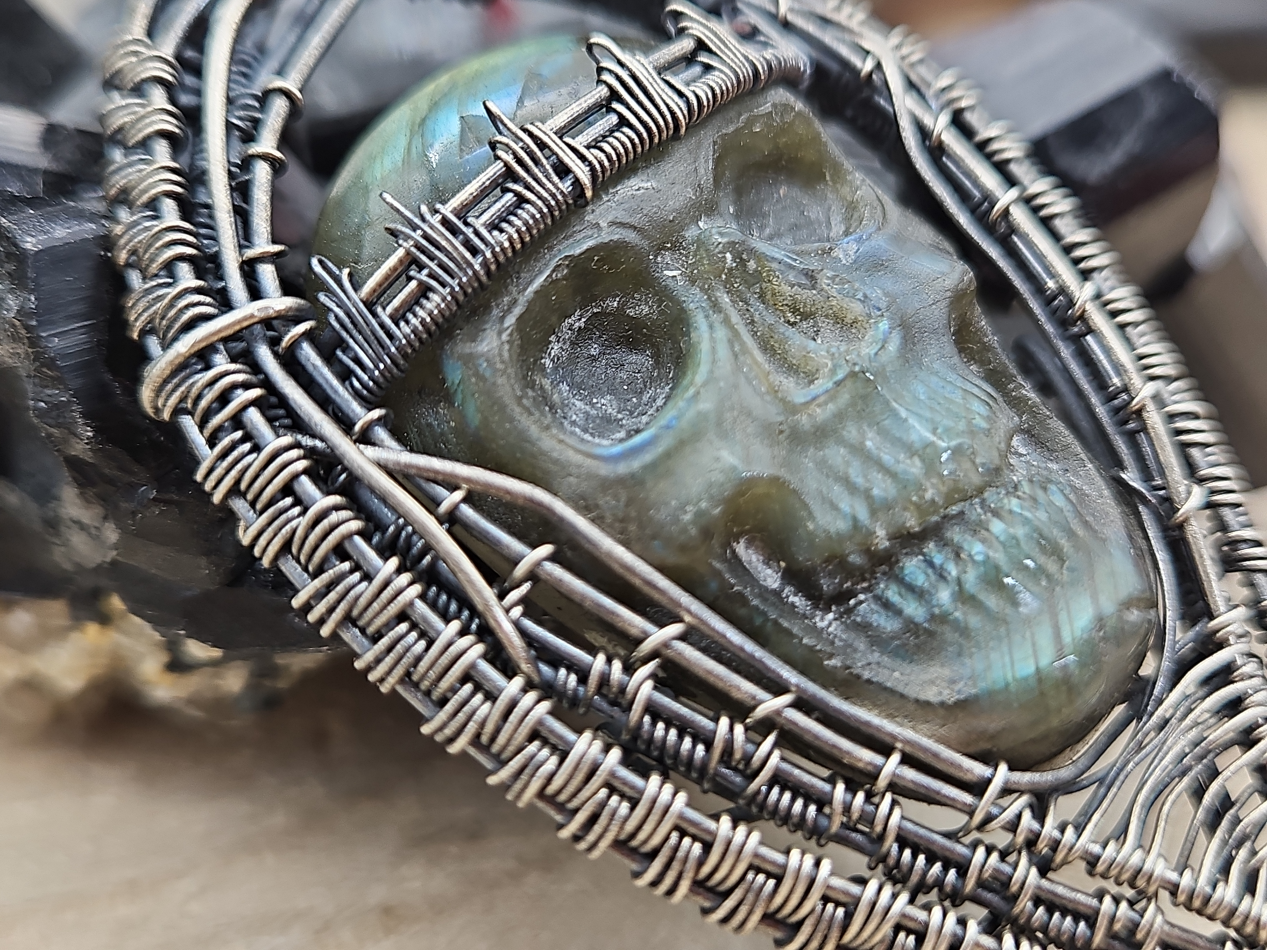 Ausgefallener Anhänger im Heady-Style mit einem Skelettschädel aus Labradorit. Groß, aufwändig, auffällig. Das Silber habe ich patiniert, so kommen die einzelnen Muster wie auch das Leuchten des Steines besser zur Geltung. Unterhalb der Öse ist ein weiterer kleiner Labradorit eingearbeitet.