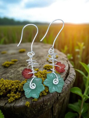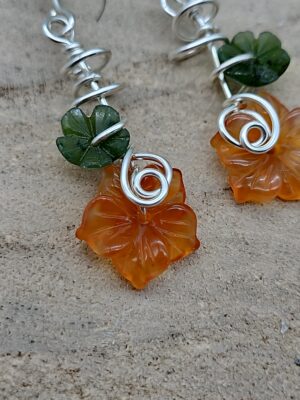 190,00 €Statt Blumen im Haar gibt’s hier Blumen am Ohr. Zarte orangene Karneolblüten, dazu erdig grüne Nephrite, ebenfalls zu kleinen Blümchen geschnitzt. Kombiniert mit kühlem Sterlingsilber, das sich verspielt um die Blumen wickelt.