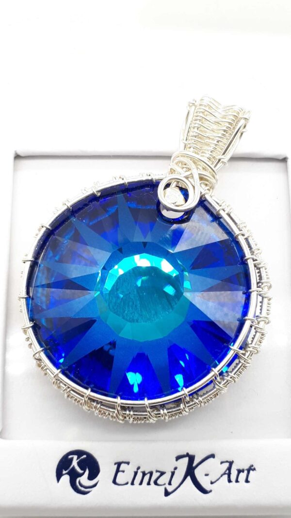 Wundervoller ‚Sun Pendant‘, den ich in eine edle Sterlingsilberfassung gewebt habe. Hier in der Farbe „Bermuda Blue.“ Die Fassung ist dezent gehalten, damit dieser Spiegeleffekt auch richtig gut zur Geltung kommt.