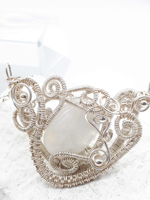 Außergewöhnlicher Kettenanhänger mit einem blau schimmernden, teils durchsichtigen weißen Labradorit (auch Regenbogenmondstein genannt). Der Stein verfügt über einen zarten, bläulichen, teilweise auch mehrfarbigen Schimmer. Gefasst wurde in 925er Silber. Aufwändig in Handarbeit umwebt und somit wurde ein unvergleichliches Unikat geschaffen. Nicht besonders dezent, sondern besonders und Einzik-Artig.